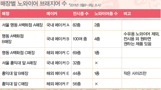 직접 브래지어 매장을 돌아보았다. 서울 명동의 A백화점 4층 란제리 매장. A 국내 메이커 매장에는 진열대의 제일 구석에 보라색과 연지색 두 가지의 노와이어 브래지어가 있었다. “튀지 않는 색을 원하시면…”이라며 한 매장 직원은 수유용과 같이 걸린 살색의 노와이어를 권했다. 건너편 B 국내 메이커 매장, 전면에 길게 배치된 진열대에 노와이어는 하나도 없다. 노와이어를 찾자 구석편에 놓인 매대로 데려갔다. 3종의 노와이어 브래지어가 있었다. “그것도 맘에 들지 않는다면?”이라며, 진열대 밑 서랍에서 패드가 든 노와이어 브래지어를 꺼내줬다. 1월 출시품이라고 했다. “진열대에는 진열 안 하시네요?”라고 묻자 “다른 예쁜 브라들이 많으니까요”라 했다. C 해외 메이커(프랑스) 매장에도 노와이어가 많이 걸려 있진 않았다. 그러나 매장 직원은 지금까지 본 것 중 가장 예쁜 색의 브래지어를 보여줬다. 직원은 “한 라인이 출시되면 한 종 정도는 노와이어”라고 답했다. 한 라인이란 5~6종의 비슷한 제품군을 말한다. “많이 찾느냐”고 묻자 “많지는 않다. 나이 드신 분과 가슴이 작으신 분이 찾는다”고 답했다.