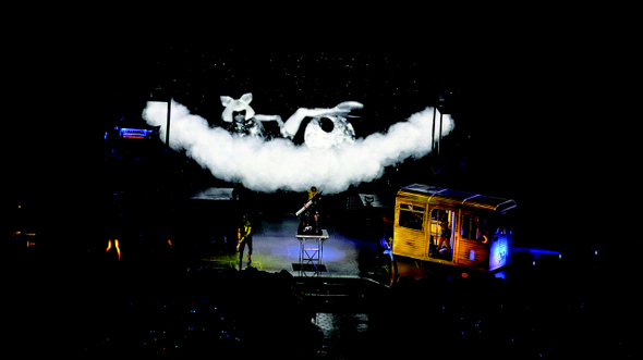 다소 지루한 디제이의 오프닝 무대와 뉴욕 출신의 밴드 ‘시저 시스터스’의 게스트 무대가 1시간을 잡아먹고 무대 전환으로 거의 40분 넘게 공연이 지연됐지만, 관객들은 불평 한마디 없이 오히려 파도타기를 하며 공연을 기다렸다. 마침내 무대 전면 대형 스크린에 아주 천천히 움직이는 가가의 요염한 포즈가 인트로 영상으로 나오고, 어둠 속의 막에 실루엣을 드러낸 그녀는 <어둠 속의 춤을>을 시작으로 공연에 돌입했다. 조용하던 스테이플스센터의 관객 2만5천 명은 모두 일어나 흥겹게 춤을 추기 시작한다. 가가의 인트로 공연은 1980년대 유행한 ‘솔 트레인’의 일렉트로닉한 팝 버전으로 느껴졌다. 근육질의 남성 댄서와 요염한 여성 무희들 사이로 타고 흐르는 가가의 퍼포먼스는 강렬한 영상 이미지와 잘 짜인 안무 덕분에 마돈나보다도 더 선정적이고 비욘세보다도 더 감각적이었다.