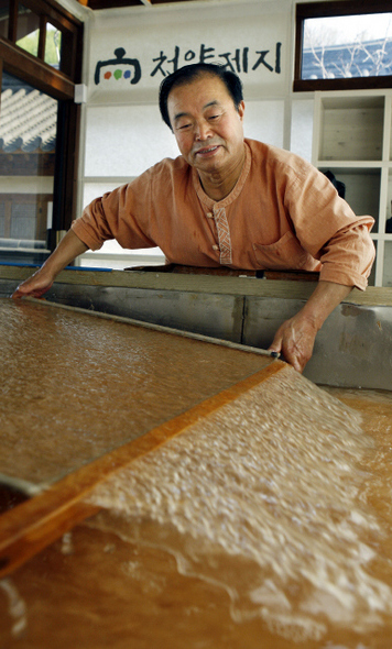 선이 고운 처마로 달랑달랑 바람이 든다. 지나는 이들의 발길을 붙잡는 어여쁜 한옥. 그곳이 박선태(71)씨의 일터다. 별다른 자원도 특별한 지원도 없던 예향의 마을 전북 전주에는 소중한 자산이 둘 있었으니, 그 하나는 맛스러운 음식이요 다른 하나는 으뜸가는 한지(韓紙)다. 유난히 물이 좋아 닥나무가 많이 생산됐고, 장인들이 간직한 고유의 기술력으로 고려시대 중기 이래 조선시대 후기까지 왕실의 진상품으로 들어가는 질 높은 한지를 만들어왔다.