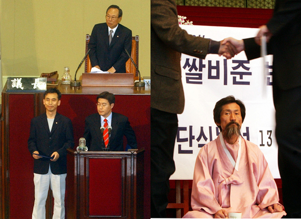 신라호텔뿐 아니라 국회에서도 한복은 낡고 부정돼야 할 것으로 여겨진다. 강기갑(58) 민주노동당 전 대표는 농민운동을 하던 1990년대 초부터 개량한복을 입었다. 2004년 6월 초 17대 국회 첫 등원날 국회 입구에서부터 경찰에게 제지당했다. 강 전 대표는 평소처럼 긴 수염에 개량한복 차림이었다. 승용차도 없었다. 강 전 대표는 “당시 경비 책임자에게 ‘서민은 막고 자가용 타고 양복 입으면 통과시키느냐’고 강하게 항의했다”며 “17대 국회 때도 김원웅 전 의원이 광복절날 빼먹지 않고 한복을 입었을 뿐 대부분 의원들이 ‘용기를 못 내겠다’며 한복을 입지 않았다”고 말했다. 강 전 대표는 17대 등원 뒤 개량한복 대신 두루마기를 입었고, 지금도 여전히 두루마기를 고집한다. 강 전 대표는 “헐렁해서 피부 호흡에도 좋다. 한나라당 의원 중에 ‘한복을 입어보고 싶은데 눈치가 보이고 용기가 안 난다’고 하는 분도 꽤 있다”고 전했다. 국회에서 ‘권위 있고 바른 것’은 양복이다. 유시민 국민참여당 대표가 2003년 당선돼 면바지를 입고 등원했을 때 한나라당 의원 수십 명이 집단 퇴장한 사건은 유명하다.