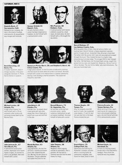 높이 114.1cm에 너비 83.6cm의 종이에 인쇄된 내용은, 1989년 5월1∼7일 일주일간 <타임>에 보도된 미국 내 총기사망자 460명의 사진과 사건 개요다. 본디 책자로 만들 생각이었는지, 25쪽으로 구성된 내용이 날짜순으로 펼쳐져 있다. 각 페이지에 16~20명을 담았고, 사망자 사진이 없을 땐 남녀의 증명사진 실루엣 이미지를 실었다. 특이한 사건은 크게 실었는데, 내용이 괴이쩍다. 콜로라도 라스아니마스 카운티에서 사망한 대럴 홀먼(37)은, 그야말로 어이없게 죽었다.