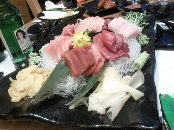 마침 가는 날이 장날. 매주 수요일 저녁 8시에 진행한다는 참치회 뜨는 광경을 직접 목격할 수 있었다. 큰 도마 위에는 어른 반만한 크기의 반토막 참치가 입을 벌리고 누워 있었다. 실장님(참치집의 주방장은 대개 실장님으로 불린다)이 참치 볼살과 머릿살을 잘라 내왔다. 마치 꽃등심 같았다.