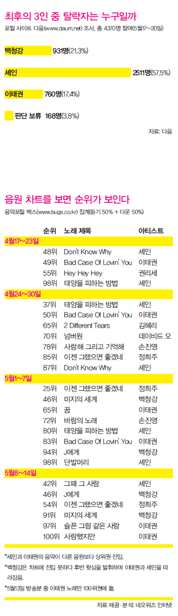 최후의 3인 중 탈락자는 누구일까. 음원 차트를 보면 순위가 보인다.