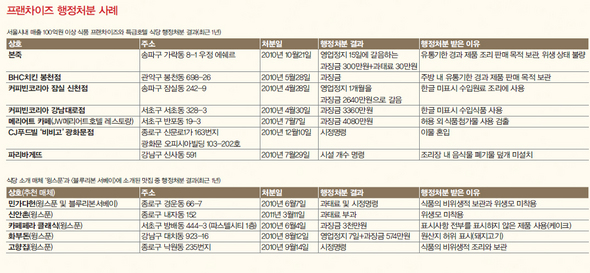 흔치 않게 죽 프랜차이즈를 표방해 성공한 ‘본죽’ 송파 오금점이 유통기한이 지난 식재료를 조리 목적으로 보관했을뿐만 아니라 위생 상태가 불량해 지난해 10월21일 과징금 300만원과 과태료 30만원의 행정처분을 받았다. BHC치킨 봉천점은 유통기한이 6일 지난 닭고기를 사용하려다 적발돼 지난해 5월 관악구청으로부터 영업정지 15일의 행정처분을 받았다. BHC치킨은 연매출이 600억원을 넘는 대표적인 치킨 프랜차이즈다. CJ푸드빌이 운영하는 한식당 ‘비비고’ 광화문점에서 지난해 12월 돌솥비빔밥을 먹은 손님이 밥에서 작은 돌멩이를 발견해 항의하는 일이 벌어져 종로구청으로부터 시정명령을 받았다. 파리바게뜨 강남구 신사동점은 음식물 폐기물통에 뚜껑을 달지 않아 주방에서 악취가 진동한 탓에 구청으로부터 시설개수 명령을 받았다. 본죽과 CJ푸드빌에 당시 사건에 대해 질의했으나 답변을 거부했다.