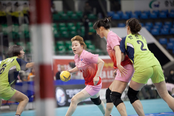 용인시청 권근혜 선수(왼쪽에서 두번째)가 4월13일 서울 잠실학생체육관에서 열린 SK핸드볼 코리아리그 광주도시공사와의 개막전에서 공격을 시도하고 있다. 대한핸드볼협회 제공