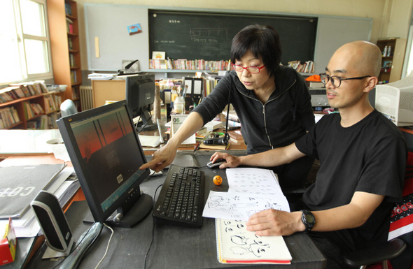 주변 환경의 변화는 만화가에게 직접적인 시각적 자극을 준다. ‘새만화책’ 공동대표인 김대중(오른쪽)씨와 조경숙씨가 폐교를 개조한 작업실에서 논의 중이다. 한겨레21 이종찬