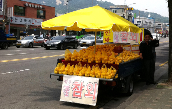 노랗고 빨간 형형색색의 과일 맛을 떠올리게 하는 과일 행상 천막은 간판이 없어도 색과 형태만으로 나를 끌어당긴다. ‘척 하면 척’이다. 물론 리어카 안에 담길 과일도 과일 나름이다. 장출혈성 대장균 감염의 확산으로 독일에서 절대 먹으면 안 되는 금지 1호로 대접받는 오이에 대한 뉴스에서 채소와 과일은 의심의 사물이다. 그래도 나는 천막에서 파는 과일이 참 예뻐 보인다.