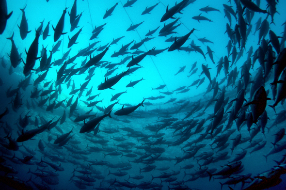 참치가 수송용 우리 안에서 헤엄치고 있다. 지금과 같은 속도로 참치를 잡아들인다면 이 거대하고 아름다운 생명체는 가족을 잃고 방황하다 더 이상 번식을 못하고 바다에서 사라질지 모른다. 환경운동연합 제공