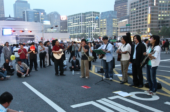 2008년 6월10일 서울시청 앞에서 열린 미국산 쇠고기 수입 반대 촛불집회에서 아마추어 연주자들로 이뤄진 시민악대가 교통이 차단된 도로 위에서 즉석 공연을 펼치고 있다. 한겨레21 정용일