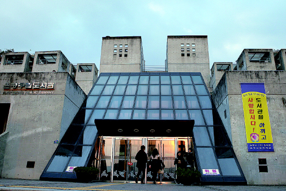 은평구립도서관은 불광근린공원의 서쪽 산기슭에 있다. 집은 본래 서향으로 잘 짓지 않는다. 하물며 마을 뒤쪽 경사지다. 그 약점을 장점으로 만든 건물이 은평구립도서관이다. 곽재환씨가 설계했다. 놀랍게도 벌써 10여 년 전이다. 기존 도서관의 정직한 겉모습을 떠올려서는 곤란하다. 잘 지어진 박물관이나 미술관과도 다르다. 좀더 상상력을 발휘해보기를 바란다. 우선 가장 아래쪽이 주차장이다. 여기서 좌우로 난 계단을 오른다. 계단참에는 소나무가 가지를 드리운다. 계단을 돌아서는 5개의 콘크리트 기둥이다. 푸른 넝쿨이 휘감아 오른다. 각각 살다(生), 알다(知), 놀다(戱), 풀다(業), 빌다(祈)의 의미를 담은 솟대다. 은평구립도서관의 기능이자 상징이다. 그제야 지하 1층, 지상 3층의 도서관이 몸체를 드러낸다.