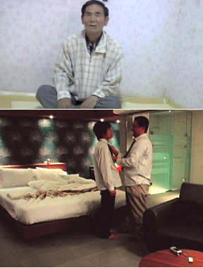 칠순쯤 돼 보이는 한 노인이 방으로 들어온다. 카메라 앞에 서서 바지를 내리고 자위행위를 시작한다. 이상우 감독의 <청춘의 발기>는 노인들의 외로움을 그린 다큐멘터리다. 전체 영화는 아직 완성되지 않았다. 이번 미디어아트전에서는 어떤 노인의 자위행위 장면만을 상영했다. 영화 <엄마는 창녀다>를 연출한 이 감독은 2008년 서울 종로 파고다공원에서 한 노인을 만났다. 노인은 정말 외로울 땐 방에서 혼자 자위행위를 한다는 이야기를 털어놓으며 촬영이 시작됐다. 7분짜리 단편영화의 시간은 한 노인이 지지부진한 자위를 끝내기에는 모자라고, 지켜봐야 하는 관객에게는 턱없이 긴 시간이다. 감독조차 좁은 방 한켠에 카메라만 남겨두고 자리를 떴다. 관객은 성기보다 더 외로운 노인의 얼굴에서 시선을 거두기가 힘들다. 흥분 대신 슬픔이, 어쩌면 권태가 밀려든다. 감독은 자위행위 장면 절반을 잘라서 전반과 후반을 거꾸로 편집했다. 실제로는 자위행위를 끝낸 할아버지가 옷을 입는 장면인데 거꾸로 돌려서 옷을 벗고 있는 듯 보인다. 이상우 감독은 “노인들이 다시 젊은 시절로 돌아가고 싶어하는 회춘의 욕망을 나타내기 위해서 거꾸로 편집했다”고 설명했다. 관객은 저도 모르는 새 처음과 끝이 다를 바 없는 공허한 욕망의 순환선에 탑승하는 셈이다.