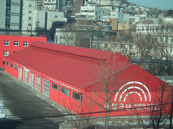 국립극단이 서계동에 자리잡은 것은 도심에 위치하지만 좀처럼 문화시설이 들어서지 못한 지역에 ‘진출’했다는 의미뿐만 아니라, 기무사 수송대 부지, 곧 군 시설 터가 극장으로 바뀌었다는 의미도 있다. 서계동 1번지는 1981년 12월 기무사 수송대 부지로 조성돼 군차고지와 차량정비소로 사용됐다. 그러다가 기무사가 다른 지역으로 이전하자 한동안 빈 공간으로 남아 있던 이 건물은 지난해 5월 국방부가 문화체육관광부의 문화공간 조성 제의를 받아들여 리모델링을 시작했다. 칙칙한 흰색 벽과 푸른색 지붕은 빨간색으로 칠했다. 차고·정비고·막사가 극장·연습실·사무실 등으로 바뀌었다.