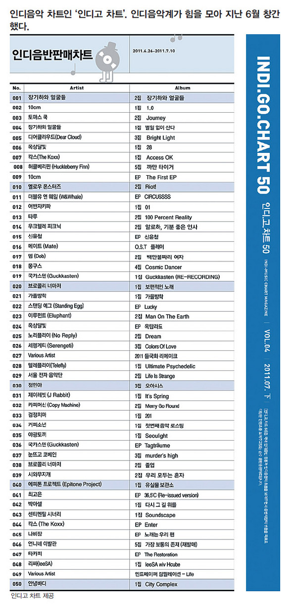 또 하나의 흥미로운 차트는 국내 인디음악을 대상으로 한 ‘인디고 차트’다. 미러볼뮤직·드럭레코드 등 인디음악계가 합심해 지난 6월 창간한 인디고 차트는 YES24·인터파크·알라딘 등 인터넷 음반 쇼핑몰과 향뮤직 등 레코드점의 인디음반 판매량을 모아 인디음악의 음반 판매 순위를 격주로 보여준다. 이 차트는 포털 사이트 다음 등을 통해 온라인으로 접할 수 있을 뿐 아니라, 종이에 인쇄돼 신나라레코드와 미화당 등 음반가게 등에 비치된다.