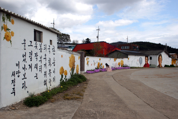 선운사 인근에는 안현 돋움볕마을과 미당시문학관도 있다. 돋움볕마을은 서정주의 시와 국화로 이뤄진 벽화가 유명하다. ‘내 누이 같이 생긴 꽃’을 닮은 동네 아주머니들의 얼굴도 벽에 그려졌다. 시월에는 가을 국화도 길 따라 화사하다. 마을을 따라 한적한 산책의 걸음을 내기에 좋다. 미당시문학관도 걸어 닿을 수 있는 거리다. 폐교를 개조해 서정주 시인의 일생을 담았다. 문학관에는 서정시인 서정주와 친일시인 서정주의 작품이 공존한다. 옥상에 오르면 돋움볕마을의 전경이 한눈에 내려다보인다.