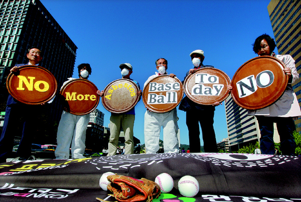 숨가쁘게 보도된 대로, 관중 600만 시대를 달려가는 프로야구가 ‘석면 공포’에 휩싸였다. 환경보건시민센터가 소중한 일을 해냈다. 환경부도 뒤늦게야 사태의 심각성을 깨달았다. 환경부는 국내 5개 야구장 관계기관에 사용 중지를 요청했다. 어느 구장보다도 관중의 운집과 열기가 뜨거운 잠실·사직·문학구장과 경기도 수원과 구리의 야구장 등 5개 야구장이 그 대상이다. 그러나 한국야구위원회(KBO)는 ‘경기장 사용 중단은 곧 리그 중단’이라며 그라운드에 쉼없이 물을 뿌리며 시즌을 강행하고 있다.