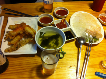 이렇게 토요일 저녁을 보낼 수 없었다. 급만남(?)이 필요했다. 동네 후배를 호출했다. 장소는 서울 지하철 이수역 앞 ‘싱싱오징어바다’. 술 사준다는 말에 후배녀석은 얼씨구나 좋다고 뛰쳐나왔다. 과자 사준다는 말에 아들녀석도 얼씨구나 좋다고 따라나왔다. 토요일 저녁, 남자 셋이 모였다. 참담했다. 모든 안주가 1만원 남짓으로 균일한 싱싱오징어바다는 가볍게 한잔 마시기 좋은 곳. 먼저 광어회 작은 거랑 아들녀석 먹일 새우튀김, 그리고 소맥을 시켰다. 이윽고 나온 광어회는 가격 대비 맛이 괜찮았지만 새우튀김은 약간 눅눅했다. 아들녀석은 장난감을 가지고 놀면서도 “엄마 언제 와?”라고 4분에 한 번꼴로 물었다. 후배녀석과 말하는 도중 “엄마 언제 와?”라고 물어 나도 모르게 FTA로 말하려다 엄마라고 발음하게 되는 지경이었다. 후배녀석은 “<개콘>의 ‘생활의 발견’이구만~”이라며 혀를 쯧쯧 찼다. 술값 니가 낼래?