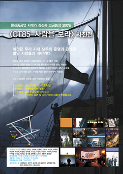 희망버스 동승 사진기자들의 사진전 ‘사람을 보라’ 300일 넘도록 부산 영도의 앞바다에서 카메라는 높은 곳을 향했다. 높은 곳에서는 침묵이, 땅에서는 분노의 함성이 높았던 세월이다. 사진집 <사람을 보라>는 희망버스에 동승했던 사진기자들의 카메라에 담긴 희망버스의 순간들과 그에 관한 이야기다. 고공농성의 영상기록이기도 하다. 수유너머R는 연구실 이전을 기념하는 첫 전시로 이 사진집을 꺼내들었다. 11월10일자로 승리의 기록이 된 사진을 다시 보자는 의도다. <사람을 보라>에 실린 사진들이 다시 대형 프린트로 벽에 걸린다. 사진전 ‘사람을 보라’는 11월15일∼12월4일 서울 삼선동에 있는 문화예술 카페 별꼴에서 열린다. 문의 070-8268-7355,