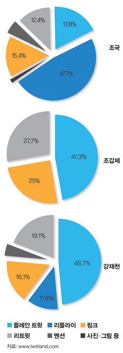 왜 한국의 보수 논객은 트위터에서 열세일까? 트위터 활동 숫자만 보면 한나라당이 민주당이나 민주노동당에 결코 뒤지지 않는다. 그런데 한 인터넷 매체 조사에 따르면, 지난 10·26 서울시장 보궐선거에서 박원순 후보를 지지하는 트위터 사용자 중 가장 많이 퍼뜨려진 메시지의 주인공은 조국 서울대 교수로 재전송 횟수가 3만5천 번에 이른다. 대표적 나경원 후보 지지자인 강재천 민보상법개정추진본부장의 멘션은 7500번 재전송됐다. 문제는 숫자가 아닐 수 있다. 이승경 실장은 대다수 보수 인사들이 자신의 멘션을 말할 뿐 다른 사람의 의견에 반응하지 않는, 일방적 소통 방식을 보이고 있다고 지적했다. 트위터상에서 ‘좌파’는 대체로 다른 사람의 의견에 반응하고, ‘우파’는 자신의 할 말만 한다는 것이다. 트위터에 올리는 멘션의 유형을 분석하는 사이트인 트위터랜드닷컴( http://twtrland.com)에서 분석해보니 그 차이는 분명했다. 강재천 본부장(그래픽1)은 자기 주장을 올리는 플레인 멘션의 비율이 48.7%로 가장 높았다. 다른 사람의 의견에 답하는 멘션은 11.6%로 낮았다. 이에 비해 조국 교수(그래픽2)는 다른 사람의 말에 대한 대답이 47.7%로 가장 높고, 자신의 주장은 17.8%였다. 대표적 보수 논객인 조갑제씨(그래픽3)는 자기 주장이 47.3%, 리트윗 27.7%이었다. 다른 사람의 의견에 대한 답글은 아예 찾아 볼 수 없었다(11월11일 기준).