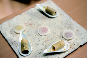 한식이 세계적 주방장들의 도마 위에 올랐다. ‘서울고메 2011’에서 파스칼 바흐브(왼쪽)와 상훈 드장브르가 만찬을 준비하고 있다. 아래는 그들이 선보인 새로운 한식 요리들. <한겨레21> 박승화 기자