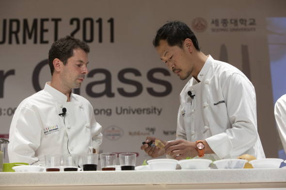 파스칼 바흐보와 상훈 드장브르 외에도 스페인의 호안 로카, 스웨덴의 비요른 프란첸, 미국의 주디 주, 프랑스의 스테판 르루 등 세계적인 스타 셰프 6명이 10월31일부터 11월4일까지 열린 ‘서울고메 2011’에 참가했다. 한국의 식재료와 한식의 맛과 멋을 알리려는 목적으로 올해 3회째 열린 이번 행사에서 해외 셰프들이 특히 관심을 보인 재료는 각종 나물과 된장·간장·고추장 등 발효식품이었다. 영국의 요리 월간지 <산 펠레그리노>가 선정한 ‘2011년 세계 최고 레스토랑 50’에서 2위 레스토랑으로 뽑힌 ‘엘 세예 데 칸 로카’의 셰프 호안 로카는 자신의 마스터 클래스에서 한국의 흑마늘과 스페인 요리의 접목을 시도했다. 이미 된장을 이용한 요리를 레스토랑의 정식 메뉴 중 하나로 선보이고 있는 그는 “한국 요리는 스페인 요리와 상당히 비슷하다. 한식은 특징이 확실하기 때문에 앞으로 세계화하는 데 큰 이점이 있을 것이다”라며 한식의 발전 가능성을 긍정적으로 평가했다. 레스토랑 ‘플레이보이 클럽 런던’을 운영하는 주디 주는 ‘한식의 세계화’라는 주제로 진행된 마스터 클래스에서 된장과 겨자를 혼합해 만든 소스를 참치에 뿌린 요리, 푸아그라에 단감 소스를 곁들인 요리 등을 선보였다. 그는 “전통에 충실하라. 그러나 다이내믹해야 한다. 그리고 자부심을 가져라”라며 한식의 변화를 부추긴다.