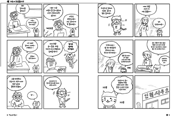 그 뒤로 야옹이와 흰둥이는 어떻게 됐을까. 이들은 일하고, 일하고, 또 일했지만 생의 고단함과 빚이 줄어드는 속도는 정비례하지 않았다. 정규직으로 전환될 리는 만무했고, 하루아침에 일자리가 없어지지나 않으면 다행이었다. 야옹이와 흰둥이가 이어가는 일상은 우리 주변 보통 사람들의 삶을 대변하고 있었다. 흰 배경 안에서 연필로 그린 투박한 선이 이어져 살아 움직이는 야옹이와 흰둥이에게 숨결을 불어넣어준 사람이 궁금했다. 무엇이 그로 하여금 보통 사람들의 고된 삶을 이토록 촘촘하게 들여다보게 했을까.