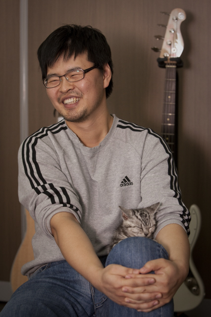 윤필씨가 작업실을 같이 쓰는 만화가 ‘HUN’씨의 고양이를 무릎에 앉히고 이야기를 하고 있다.
