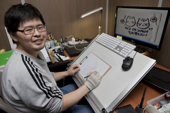 출판만화과정 수업을 들으며 그는 만화에 입문했다. 강사로 있던 이경석 작가에게 종종 콘티를 보여주었는데, 이 작가의 이사를 도와주러 갔다가 데뷔 전까지 그의 작업을 거들기로 했다. 그러다 한국만화영상진흥원에 같이 입주해 계속 작업에 손을 보탰고, ‘이제 내 만화도 그려야겠다’는 생각이 들었다. 맡은 일을 하며 틈틈이 그리려 하니 최대한 시간을 아껴야 했다. 시간을 들여 고민할 틈 없이 평소 구독하던 <한겨레21>에 실린 사람들 이야기를 소재로 삼았다. 색을 입히지 않고, 종이에 연필로 그림을 그렸다. 평소 동물을 좋아해 고양이를 주인공으로 내세웠다. 당시 고양이 만화가 인기가 많았던 영향도 있었다. “고양이 습성만 묘사해도 훌륭한 작품이 되는데, (본격 동물만화도 아니고) 왠지 야옹이만 있으면 심심할 것 같았어요. 흰둥이도 친구로 보태줬죠. 평소에 그림책 보는 것을 좋아하는데, 그림책 주인공 중에 동물들이 많더라고요. 동물이 주인공이면 감정이입도 잘되고 해서….” 그렇게 야옹이와 흰둥이가 탄생했다. 웹사이트 디시인사이드 만화 갤러리와 루리웹 만화게시판에 올리면 만화 좋아하는 사람들이 보고 댓글을 달기도 하고, 피드백이 있을 것이란 말에 그대로 실천해봤다. 반응이 기대 이상으로 폭발적이었다. 포털 사이트 다음에서 웹툰 연재 제안을 해왔다. 먼저는 흰둥이 캐릭터만 내세워 지난해 11월 <흰둥이>로 처음 정식 고료를 받고 만화를 세상에 내보이게 되었다. 올 2월에는 야옹이가 합세한 <야옹이와 흰둥이> 연재를 시작해 7월에 마쳤다. 꾸준한 인기는 출판으로도 이어졌다. 영상으로 만들어보자는 의뢰도 들어왔다.