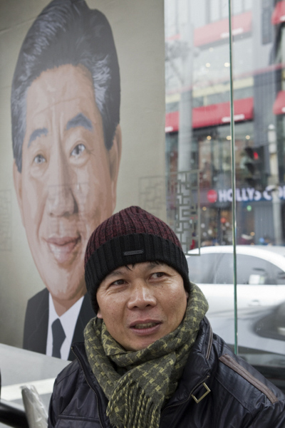 지난 1월3일 낮 서울 종로2가의 버스 정류장에서 자신의 작품 <노무현의 눈물>앞에 선 이하 작가. <한겨레21> 박승화
