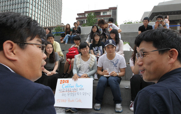 2011년 6월9일 저녁 서울 광화문 해치광장 계단에서 열린 ‘반값 등록금 실현을 위한 커피파티’에서 토론에 참여한 정재승 카이스트 교수(왼쪽)와 문화평론가 진중권씨가 이야기를 나누고 있다. 한겨레 이정우