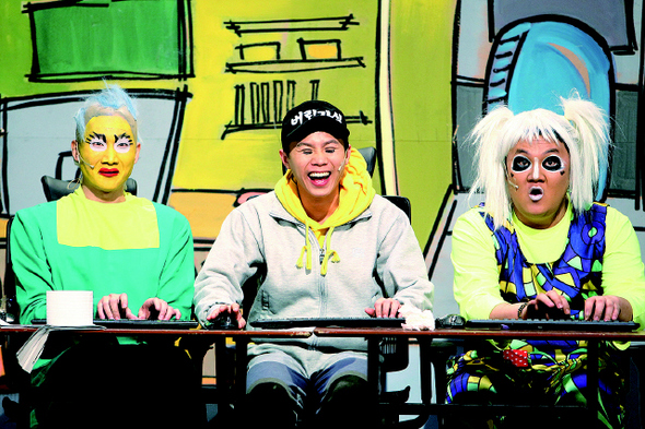 ‘아메리카노’의 안영미·김미려·정주리, ‘옹달샘’의 유세윤·장동민·유상무가 차례로 무대에 섰다. 옹달샘은 애초의 ‘기막힌 서커스’ 콘셉트를 버리고 유세윤과 장동민이 서툰 한국어의 외국인 역할을 맡은 ‘옹데어썰’로 분위기 반전을 노리고 있다. “밥 먹어도 데어(돼요)?” “집에 가도 데어?”의 장동민과 “예썰!” “잤썰!” “알았썰!”을 외치는 유세윤의 연기가 이어지는 동안 관객의 웃음도 빵빵 터진다. 스티브 잡스 분장을 하고 나타난 ‘개통령’의 김인석은 동료의 아이폰을 고쳐준 뒤, 다른 출연진이 건넨 휴대전화는 냅다 집어던진다. “이건 갤럭시잖아!” 음반제작자 양현석을 패러디한 ‘개파르타’의 무대에는 힙합계의 월드스타 윌아이엠이 깜짝 게스트로 출연해 탄성을 자아냈다.