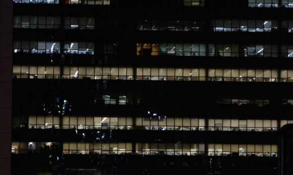 늦은 밤, 직장인들이 환하게 불을 켜고 일하고 있다. ‘하면 된다’를 강조하는 성과사회는 현대인의 내면에 상처를 입히고 우울증 환자를 양산한다. <한겨레21> 윤운식