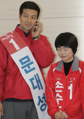 지난 3월27일 오후 부산 수영구 남천동 새누리당 부산시당에서 열린 부산선거대책위원회 발대식에 참여한 새누리당 부산 사하구갑 문대성 후보(왼쪽). <한겨레> 강창광