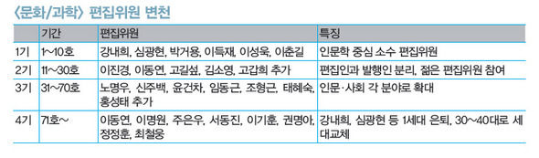 1997년 말 외환위기와 2006년 한-미 자유무역협정(FTA) 추진을 계기로 이론적·실천적 무게중심을 조금씩 달리해왔지만 <문화/과학>이 한결같이 추구해온 것은 “구조와 제도 분석을 중시해온 구좌파의 문제의식과 새로운 주체 형성의 방법론을 탐색해온 신좌파의 문제의식을 결합하는 것”(심광현 교수)이었다. 이런 <문화/과학>이 창간 20년을 계기로 편집위원진을 큰 폭으로 개편한다. 20년 동안 핵심 역할을 해온 강내희·심광현 교수는 편집위원에서 물러나고, 20여 명의 소장 인문·사회과학자들로 새 편집위원진을 꾸린다. 편집인은 2세대 편집위원으로 강내희 교수의 제자인 이동연 교수가 맡는다.