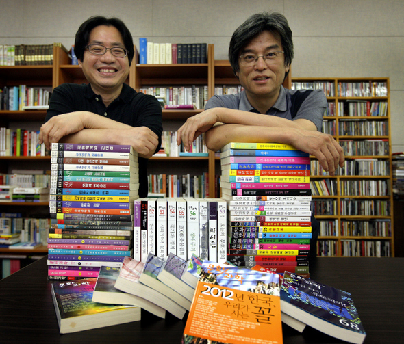 <문화/과학> 전 편집인 심광현 교수(오른쪽)과 신임 편집인 이동연 교수가 지난 20년간 발행된 잡지를 쌓아놓고 나란히 섰다. <문화/과학> 은 창간 20년 기념호인 70호부터 30~40대 소장학자들로 편집위원진을 꾸려 새 출발한다. 탁기형 선임기자