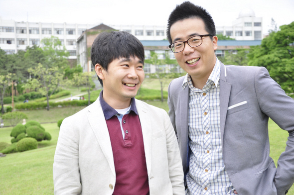 ‘진보의 불모지’ 대구에서 인터넷 민중언론 <뉴스민>을 창간한 천용길(왼쪽)·이상원씨가 5월10일 모교인 경북대 교정에서 환하게 웃고 있다. 뉴스민 제공