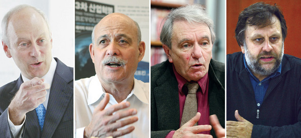 한국을 방문했거나 곧 찾을 예정인 해외의 유명 석학들. 왼쪽부터 마이클 샌델 미국 하버드대 교수, 제러미 리프킨 미국 경제동향연구재단 이사장, 자크 랑시에르 프랑스 파리8대학 명예교수, 슬로베니아 철학자 슬라보이 지제크.