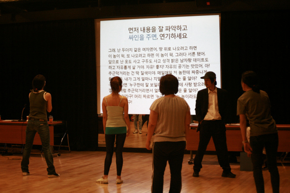 5월29일 오후 2시, 서울 종로구 동숭동 대학로 공연예술센터 5층 스튜디오는 배우들의 열기로 후끈 달아올랐다. 오전 9시30분부터 오후 4시30분까지 열린 1차 오디션은 10분 간격으로 20명씩 그룹을 지어 봤다. 모든 지시는 자막으로 주어졌고, 배우들은 자막에 맞춰 몸을 움직였다. 심사위원들은 지원자 사이를 돌아다니며 몸짓과 표정과 목소리를 읽었다.