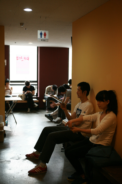 대기실에서 나름의 방식으로 긴장을 다스리는 지원자들.