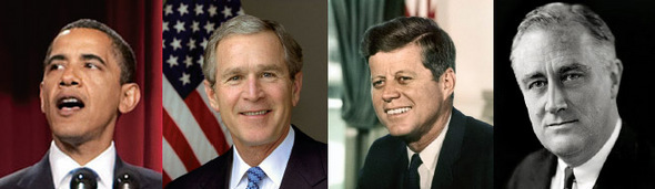하버드대학 출신 대통령들. 오른쪽부터 버락 오바마(44대), 조지 W. 부시(43대), 존 F. 케네디(35대), 프랭클린 루스벨트(32대) . 부시는 경영대학원 석사, 오바마는 법학대학원 박사과정을 밟았다. 시대의창 제공