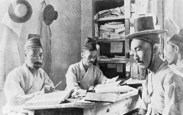 <한성순보> 편집실(추정)과 창간호. <한성순보>는 우리나라 최초의 근대 신문으로 외교통상 사무 전반을 담당했던 통리아문 소속의 박문국에서 발간했다. 김인식, 장박, 오용묵, 김기준, 강위, 주우남, 현영운, 정만조, 오세창 등 박문국 주사와 사사(司事)들이 한국 최초의 기자였는데, 한국 언론사(言論史)는 이들을 그리 중시하지 않는다. 편집국장 격인 이노우에 가쿠고로가 ‘일본인’이었기 때문이다. 전우용 제공