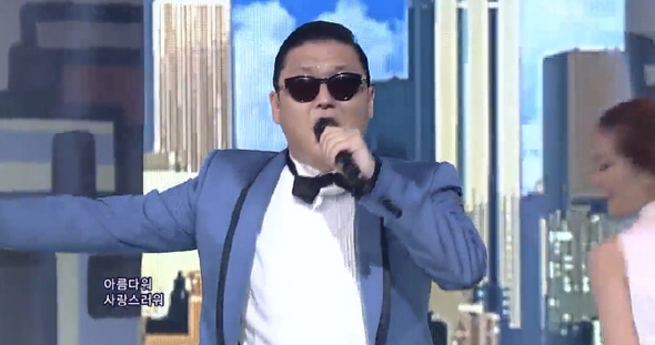 싸이가 6집 발매 뒤 첫 무대인 7월15일 SBS <인기가요>에서 <강남 스타일>을 부르고 있다. SBS 제공.