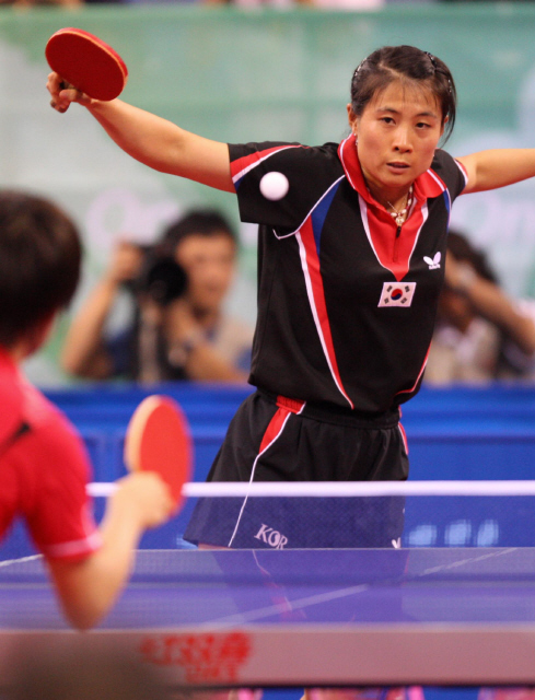 베이징대학체육관에서 열린 2008 베이징올림픽 탁구 여자 단체전 3.4위전에서 한국의 김경아가 일본의 후쿠아라 아이를 맞아 선전을 펼치고 있다. 베이징=올림픽사진공동취재단