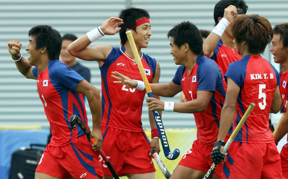 베이징 올림픽삼림공원 필드하키장에서 개최된 남자 하키 예선전 한국과 벨기에 전에 출전한 한국선수들이 승리를 확정짓는 세번째 골을 성공시킨 뒤 환호하고 있다.올림픽사진공동취재단