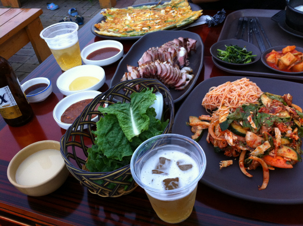 유치원에서 배운 수영에 재미 들려 환장하고 노는 아들 녀석을 겨우 어르고 달래, 저녁(술)을 먹으러 밖으로 나왔죠. 촌스런 뚱의 식성을 배려해 콘도 앞 시골장터처럼 꾸며놓은 술집으로 향했죠. 숯불바비큐, 해물파전, 골뱅이무침에 동동주와 맥주를 주문했어요. 현장에서 바로 구워서 나온 숯불바비큐는 육즙이 살아 있어 고소했고, 해물파전은 적당한 반죽과 토핑으로 바삭한 식감이 좋았어요. 골뱅이무침에 골뱅이도 많았고요. 전반적으로 콘도에서 파는 음식치고 가격도 안 비싸고 맛도 좋았죠. 아들 녀석은 저녁을 먹자마자 피곤했는지 곯아떨어졌어요. 역시 효자예요. 이제 드디어 술시. 난 생맥을 마시고, 뚱은 동동주를 들었어요. 생맥 2천cc와 동동주 한 통을 비우고 숙소로 들어왔어요. 더 먹고 싶었는데 모기가 많더라는. TV를 켜니 마침 영화 <파라노말 액티비티>를 하더군요. 덩치는 산만 해서 공포영화 보면 밤잠을 설치는 뚱이 웬일로 잘만 보더라고요. 내가 안 무섭냐고 묻자, 뚱이 심드렁하게 말하더군요. “너랑 살다 보니 이젠 무서운 게 없어. 사는 게 호러인데 뭘. 술 먹는 니가 제일 무서우니까.” 그래, 밤잠 설치고 싶구나~. 오늘 한번 지대로 무섭게 해주마~. 문의 033-439-7183.