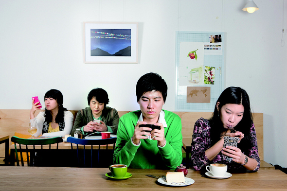 인터넷, 트위터나 페이스북, 휴대전화로 누군가와 끊임없이 접속을 시도하는 우리는 외로울 틈조차 없다. 연인을 만나서도 각자의 스마트폰을 들여다보는 우리는 도대체 왜 만난 것일까. 김정효 사진전 ‘스마트 릴레이션쉽-비동기식’ 중에서