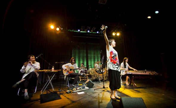 8월22일 오후 4시, 서울 종로구 원서동 창우극장 무대에서는 리허설이 한창이다. 북촌뮤직페스티벌에서 둘쨋날 메인 스테이지에 서는 ‘고래야’는 8월 한 달 창우극장에서 열리는 상설무대에 매주 수요일마다 섰다. 8월의 마지막 공연을 앞두고 연습에 한창인 이들은 언제나 처음 하는 공연처럼 연주에 몰두한다. 대금의 은은한 소리가 공기를 채우는가 하더니 곧이어 반대편에서는 흥얼거리며 기타줄 퉁기는 소리가 대금을 밀어내고 공기의 절반을 차지했다. 퍼커션·장구 등 각 악기를 맡은 이들이 자리를 잡기 시작하더니 이제는 무지막지하게 섞이기 시작한다. 장구를 잡은 김초롱이 리듬을 타기 시작하더니 옆에서 퍼커션을 두드리는 경이에게 합을 맞춰보자고 한다. 장구와 퍼커션, 심벌즈가 어깨를 결으며 하나의 리듬으로 어우러진다. 옆에서 흥얼거리며 개인 연습을 하던 옴브레도 기타를 퉁기며 이들의 리듬에 멜로디를 보탠다. 이곳에서 이들 악기는 서로 다른 장르의 것이라기보다는 상대를 지지하고 응원하는 동료 같다.
