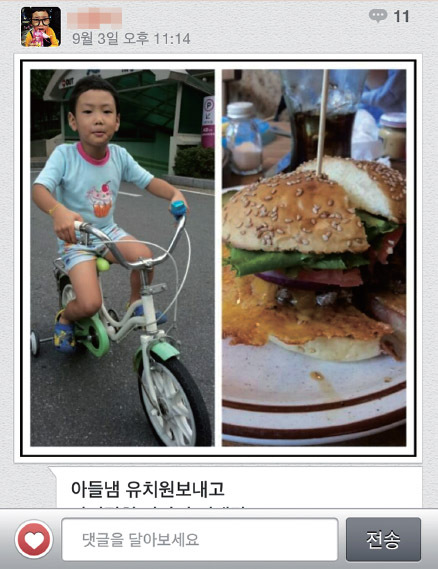 친구를 찾으려고, 소통하려고 카카오스토리에 접속한 사람들은 육아, 여행, 음식 같은 일상의 소소한 이야기를 끊임없이 올리고 댓글로 대화를 나눈다. 한 카카오스토리 사용자가 올린 글.