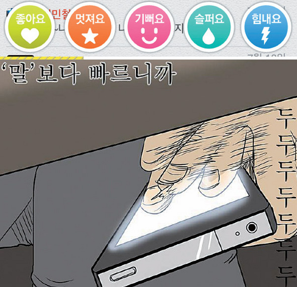카카오스토리는 페이스북의 ‘좋아요’ 버튼을 5가지 감정 버튼으로 다양화했다. 그러나 한 사용자는 “단순한 감정 표현, 그게 진짜가 아니라는 걸 모두가 안다”며 소셜네트워크서비스(SNS)관계에 대한 의문을 제기하기도 했다. 카카오톡 사용 일화를 그린 웹툰 <고삼이 집 나갔다>의 한 장면.