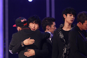 ‘슈퍼세이브’로 통과한 딕펑스 멤버 박가람(왼쪽 둘째)이 탈락한 허니지의 멤버를 안으며 위로하고 있다. 자료제공 : Mnet