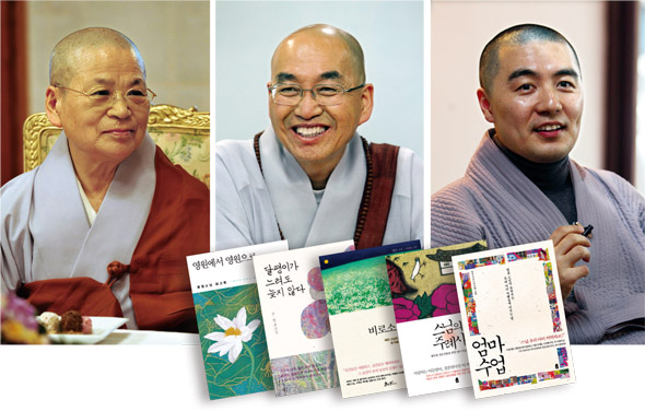 스님들이 불안과 냉소에 지친 사람들의 마음을 두드린다. 그러나 대부분 순응과 이해를 가르치는 미국발 자기계발서와 닮았다. 왼쪽부터 베스트셀러 필자로 떠오른 불필 스님, 법륜 스님, 혜민 스님. 아래는 스님들이 쓴 책들. 사진 청와대사진기자단, 한겨레 김태형, 한겨레 김태형